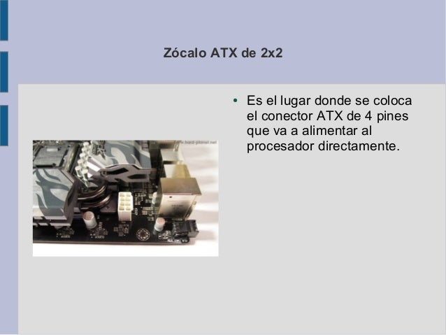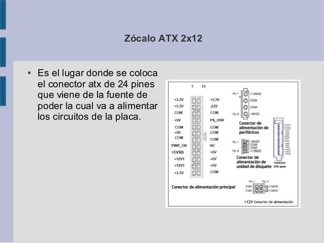 8. Zócalo ATX 2x12● Es el lugar donde se coloca el conector atx de 24 pines que viene de la fuente de poder la cual va a alimentar los circuitos de la placa.