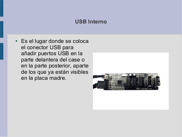 14. USB Interno● Es el lugar donde se coloca el conector USB para añadir puertos USB en la parte delantera del case o en la parte posterior, aparte de los que ya están visibles en la placa madre.