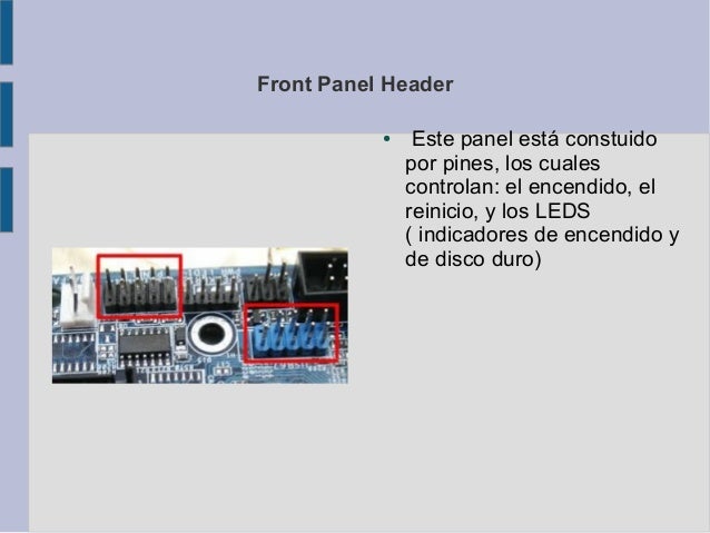 16. Front Panel Header ● Este panel está constuido por pines, los cuales controlan: el encendido, el reinicio, y los LEDS ( indicadores de encendido y de disco duro)