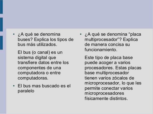 17. ● ¿A qué se denomina ● ¿A qué se denomina “placa buses? Explica los tipos de multiprocesador”? Explica bus más utilizados. de manera concisa su funcionamiento. El bus (o canal) es un sistema digital que Este tipo de placa base transfiere datos entre los puede acoger a varios componentes de una procesadores. Estas placas computadora o entre base multiprocesador computadoras. tienen varios zócalos de microprocesador, lo que les● El bus mas buscado es el permite conectar varios paralelo microprocesadores físicamente distintos.