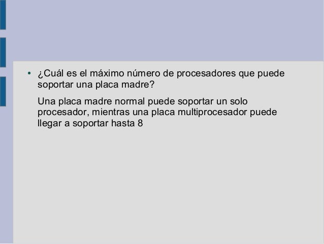 18. ● ¿Cuál es el máximo número de procesadores que puede soportar una placa madre? Una placa madre normal puede soportar un solo procesador, mientras una placa multiprocesador puede llegar a soportar hasta 8