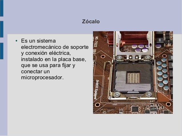 2. Zócalo● Es un sistema electromecánico de soporte y conexión eléctrica, instalado en la placa base, que se usa para fijar y conectar un microprocesador.