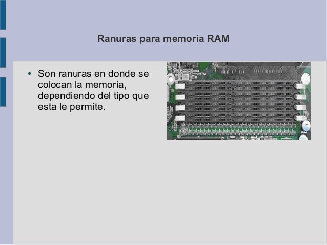 3. Ranuras para memoria RAM● Son ranuras en donde se colocan la memoria, dependiendo del tipo que esta le permite.