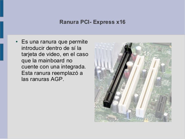 4. Ranura PCI- Express x16● Es una ranura que permite introducir dentro de sí la tarjeta de video, en el caso que la mainboard no cuente con una integrada. Esta ranura reemplazó a las ranuras AGP.