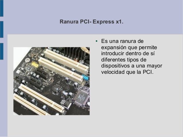 5. Ranura PCI- Express x1. ● Es una ranura de expansión que permite introducir dentro de sí diferentes tipos de dispositivos a una mayor velocidad que la PCI.