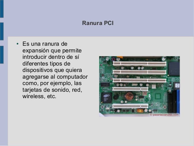 6. Ranura PCI● Es una ranura de expansión que permite introducir dentro de sí diferentes tipos de dispositivos que quiera agregarse al computador como, por ejemplo, las tarjetas de sonido, red, wireless, etc.