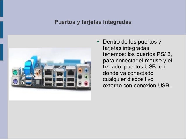 7. Puertos y tarjetas integradas ● Dentro de los puertos y tarjetas integradas, tenemos: los puertos PS/ 2, para conectar el mouse y el teclado; puertos USB, en donde va conectado cualquier dispositivo externo con conexión USB.