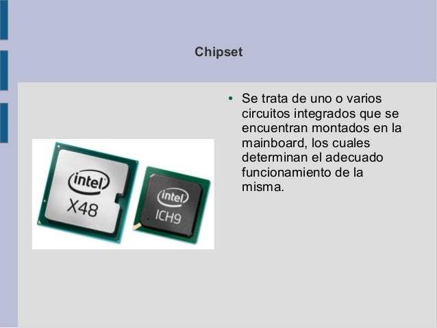 9. Chipset ● Se trata de uno o varios circuitos integrados que se encuentran montados en la mainboard, los cuales determinan el adecuado funcionamiento de la misma.